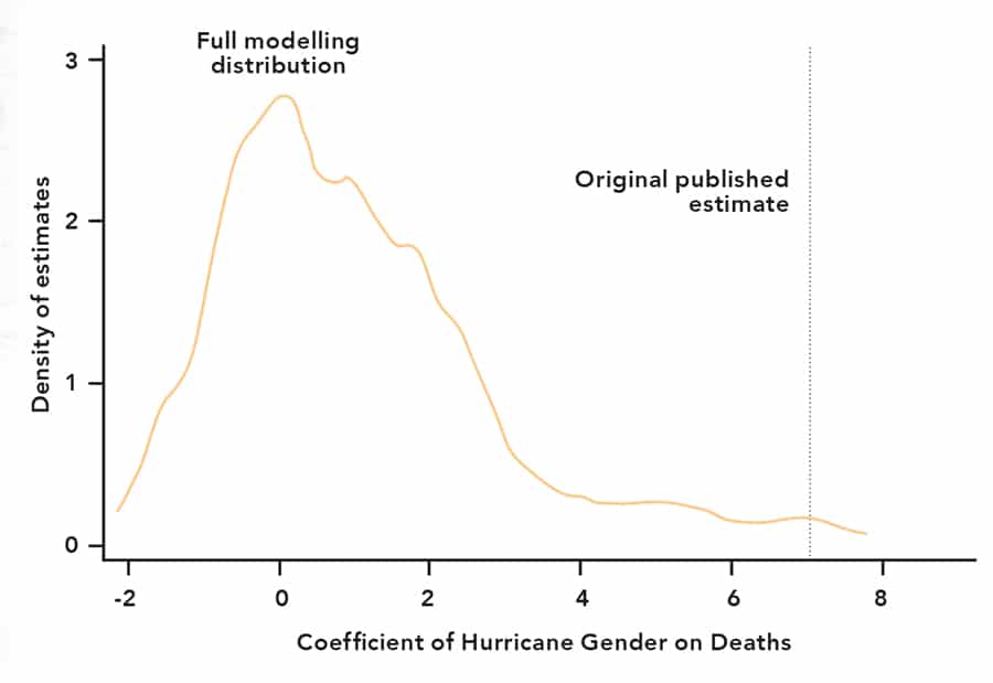 通过重新审视具有女性名称的飓风更加致命的争议的研究来说明多层分析的信息潜力。使用所有飓风的数据在美国占地六十年,研究报告称,具有女性探测名称的飓风始终如一的死亡人数。该研究启发了在原始日记中发表的一系列评论和再次进展者,并讨论了许多替代估算策略。Young博士使用这些建议的所有可能的组合来填充包括1,152个独特型号规格的多层分析。结果是讲述:绝大多数合理的模型显示出飓风“性别”的零效应,低于5%的规格支持原始索赔。几乎任何其他分析数据的方法都未能支持该研究的索赔。