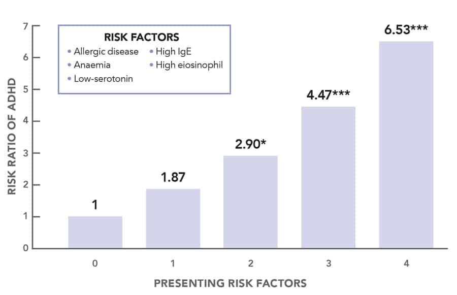 总的来说,孩子患共病的数量越多,他们被诊断患有多动症的几率就越大。四种生化因素的存在与多动症风险增加6-7倍有关。