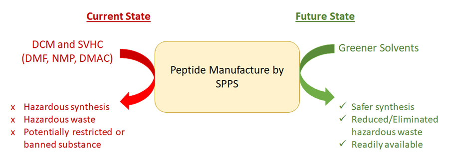 虽然能够合成肽拯救了无数生命,但用于制造肽的过程涉及到对人类和环境健康极其危险的化学品。在SPP中,DMF、NMP、DMAc和DCM等溶剂都常用于溶解过程中使用的各种受保护氨基酸。这些溶剂具有多种毒性,对胎儿有害,甚至致癌。