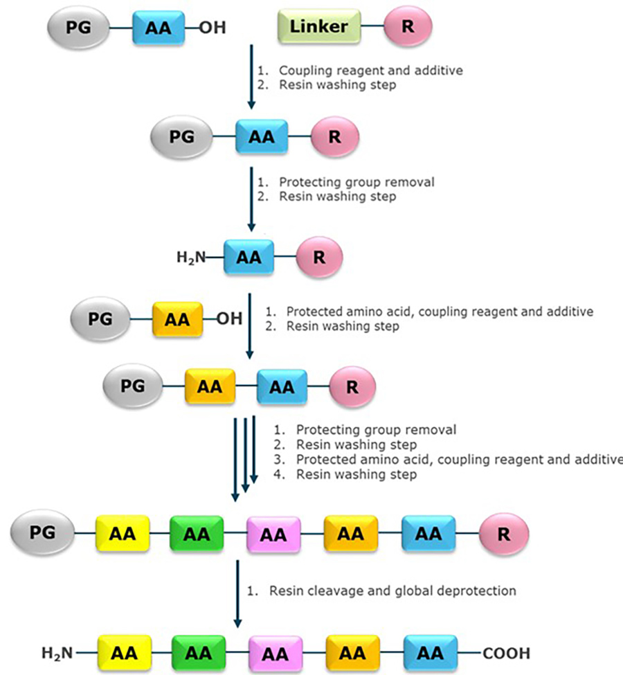 SPPS通过两种方式解决此问题。首先是使用保护团体。当添加氨基酸时,它的氨基末端含有一个保护基团,防止它在加入链末端后发生反应。第二,肽的一端固定在树脂上。每次添加氨基酸后,可以清洗和过滤树脂,去除多余的反应物。然后在对下一个氨基酸重复该过程之前,去除保护基团。这一过程意味着,即使是大肽也可以合成,超过100个氨基酸,从而为梅里菲尔德赢得了诺贝尔奖。