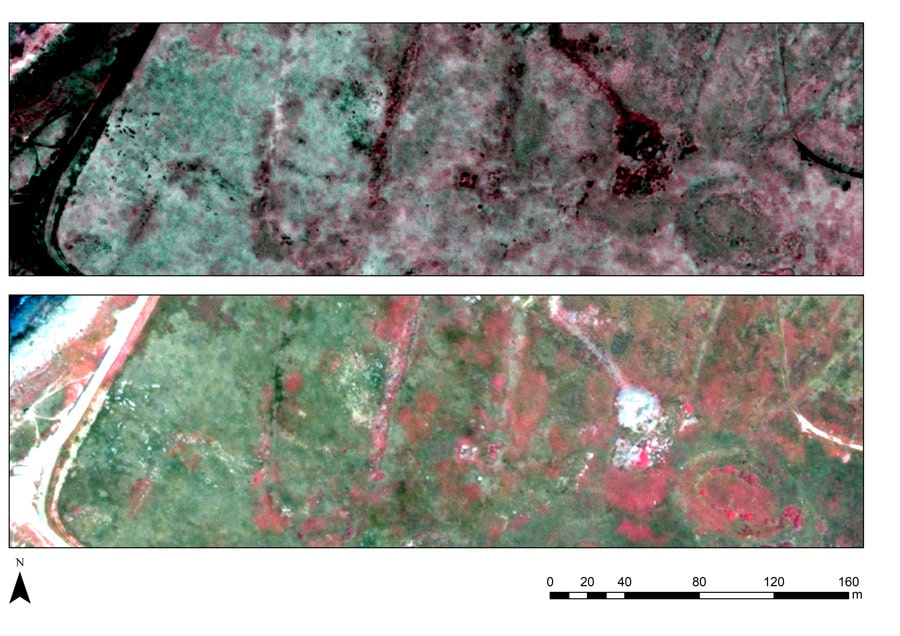 利用卫星数据探测埋在地下的遗骸所面临的挑战之一是,割痕是高度可变的。潜在的考古结构可能会使植物长得更高更健康,或更小。健康的植物叶色较深,而不健康的植物叶色较浅。这种复杂的变化反映在卫星测量的光谱特征中,并为遥感在考古勘探中的使用带来了另一个挑战。