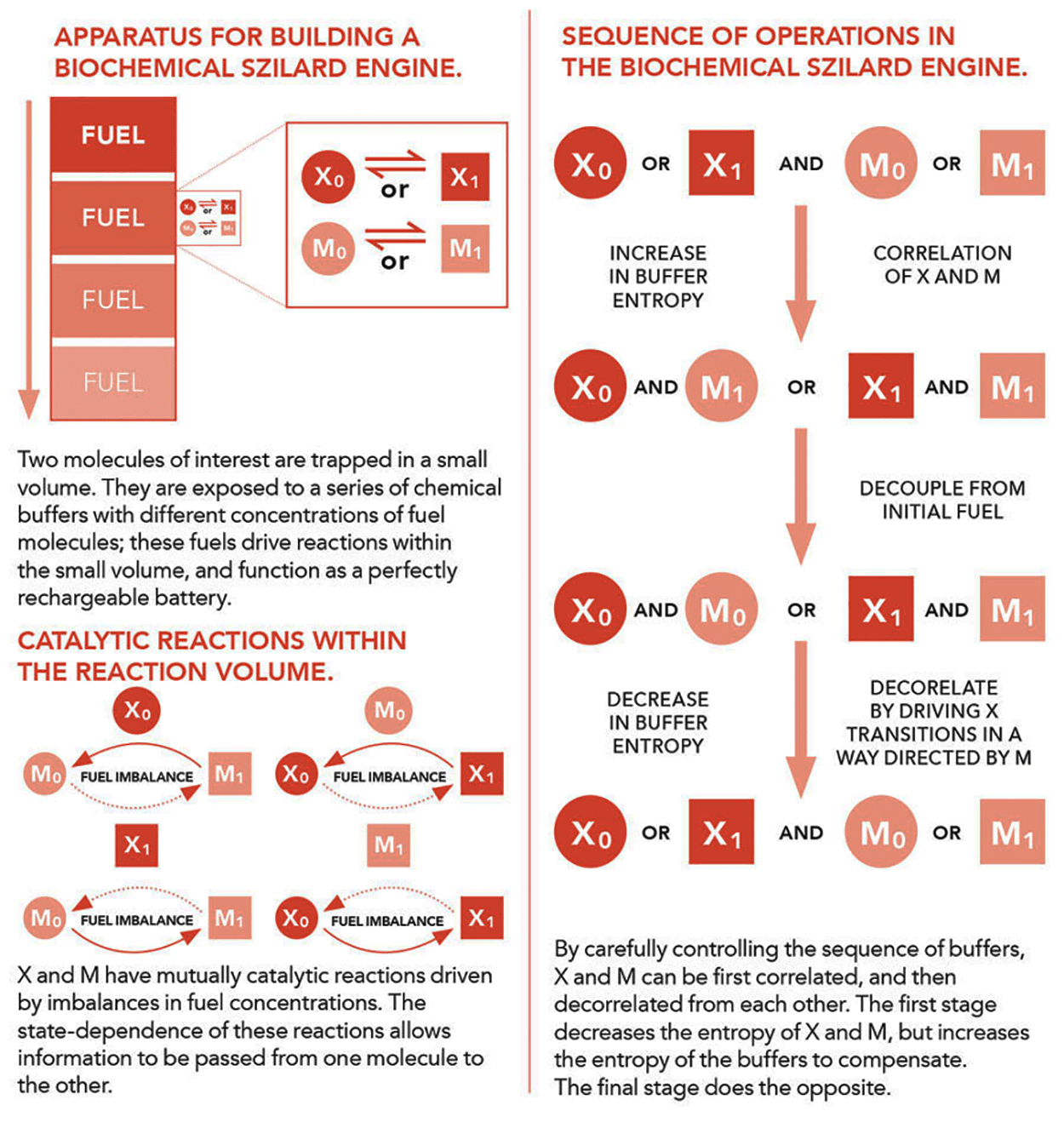 考虑到基于催化剂的发动机,其中通过在缓冲液中不同的燃料浓度驱动反应,具有较大的优势,优于Szilard的原始发动机。在粒子和重量的概念中,实验者或恶魔必须根据测量决定连接重量的位置,这是无法明确分析的步骤。在生化模型中,数据首先影响存储器,然后通过混凝土(催化)机制来影响存储器,该机制除去了恶魔的智能干预的需要。无论测量结果如何,反应体积暴露于相同系列的生化缓冲液;分子本身实现了测量和反馈。因此,奥尔杜里奇博士和他的团队可以用它们的模型确认桑德拉德索赔:关联内存和数据需要消耗资源,并使它们允许恢复这些努力。