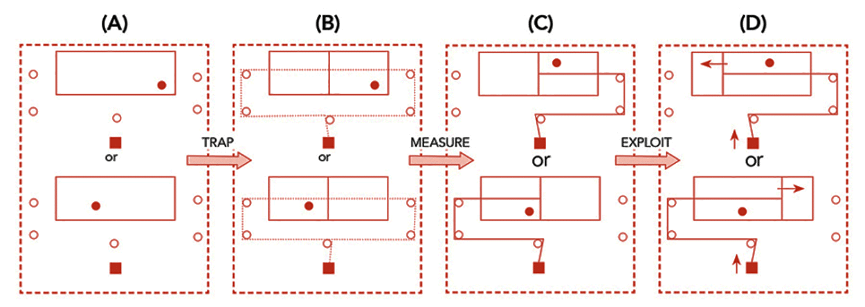 最初,系统处于四种可能的配置之一(X和M都可以处于任何一种状态),并且没有燃料存在。测量步骤通过移动一组燃料缓冲器通过反应体积,缓慢增加与X和M暴露的两种相反燃料相关的浓度失衡。当这种情况发生时,内存M的状态慢慢地与数据X的状态相关;最终系统只有两种可能的状态而不是四种:X0和M0或X1和M1。这是度量步骤的关键:熵减少了,数据存储系统是低熵资源。