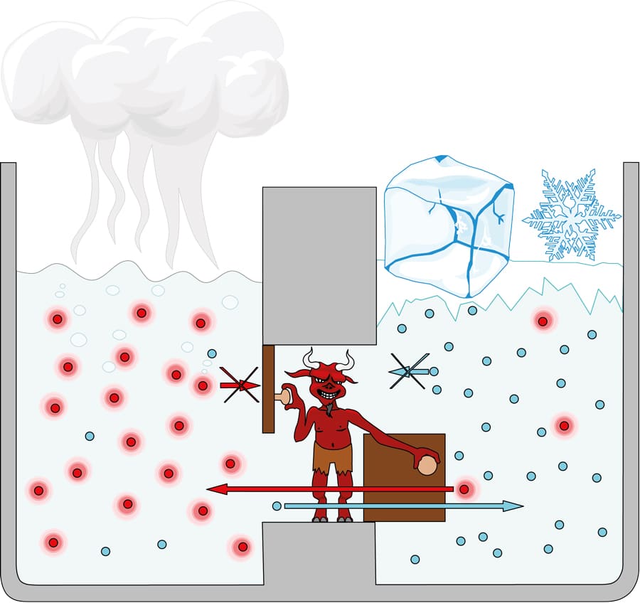 麦克斯韦想象有一种生物存在于一个装有粒子的盒子里,盒子的两半之间有一道分隔墙。这个“恶魔”可以测量粒子的速度,并在墙上打开或关闭一扇门。通过选择哪些粒子可以穿过墙,“恶魔”可以收集一边快速的“热”粒子,另一边缓慢的“冷”粒子,创造出一个之前没有的温差——恶魔把一个处于平衡状态的系统推到了平衡状态之外。