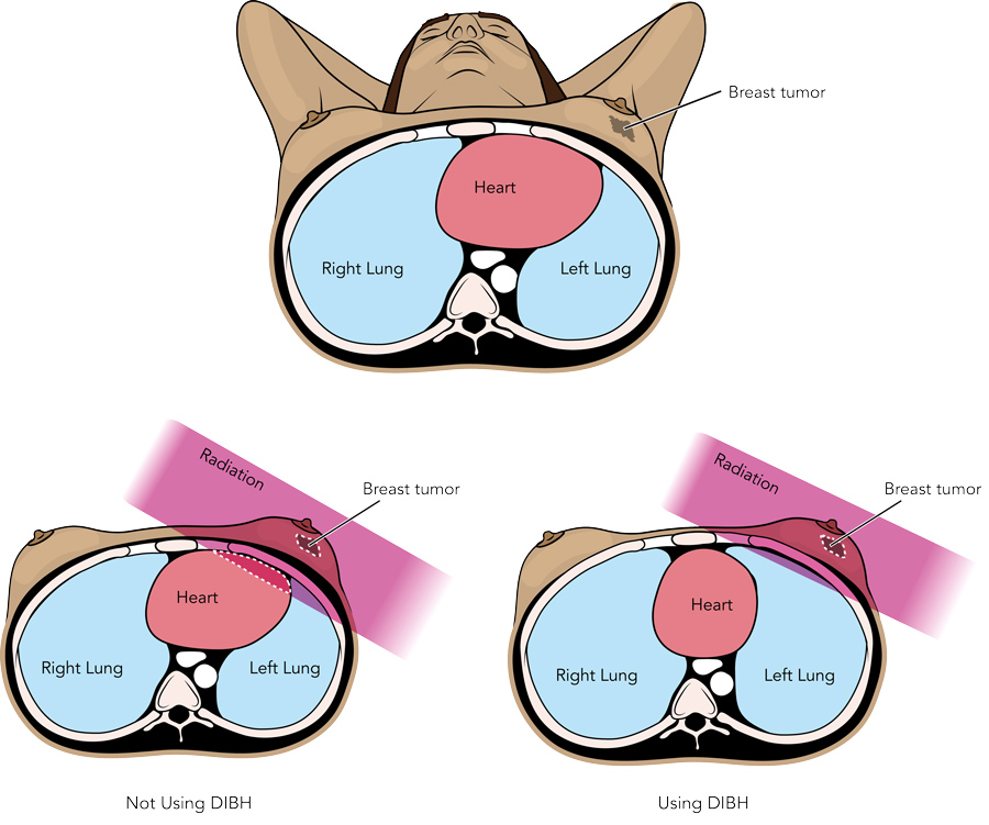 一种用来尽量减少器官暴露于不必要辐射的技术是深吸气屏息(DIBH)。DIBH是一种与传统3D适形放疗相结合的治疗乳腺癌的技术。在这种技术中,患者深呼吸,增加胸壁和心脏之间的距离,扩大肺容量,以及增加治疗区域和其他正常组织之间的距离。由于病人会屏住呼吸,这也有助于他们在放射过程中保持静止。