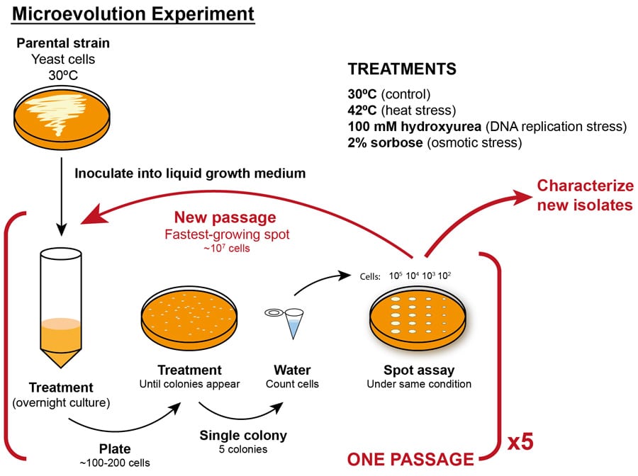 只要这些染色体重排可以是有用的,洛伦兹和他的团队就会使四种临床菌株(来自不同的地理热点)进行热量,渗透和遗传毒性。诱发渗透压力,研究人员暴露C. Auris.变成了高浓度的山梨糖。渗透胁迫是由于细胞暴露在高浓度的糖或盐中而引起的水通过细胞壁(或细胞膜)运动的突然变化。细胞可以通过应激反应机制来适应这种情况。这个过程模拟了用棘白菌素型抗真菌剂处理酵母的结果,它阻止了细胞壁的合成。与此同时,基因毒性应激是通过使用一种减少DNA复制所需的核苷酸数量的化学物质来实现的。最后,真菌在42°C的高温下生长产生了热应激。