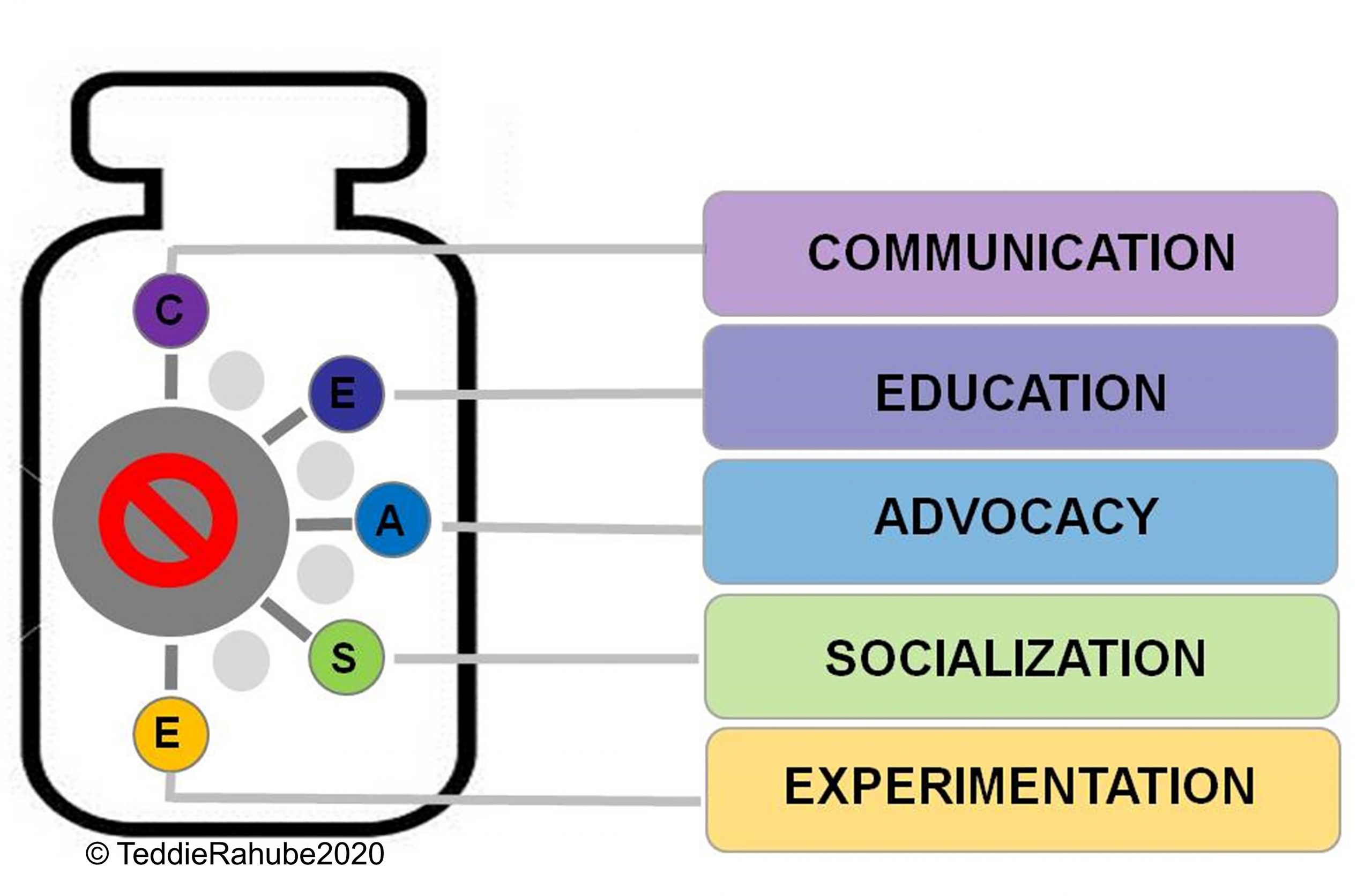 Teddie Rahube博士设计了一种多维度的方法,叫做stop,意思是“交流、教育、倡导社会化实验”。