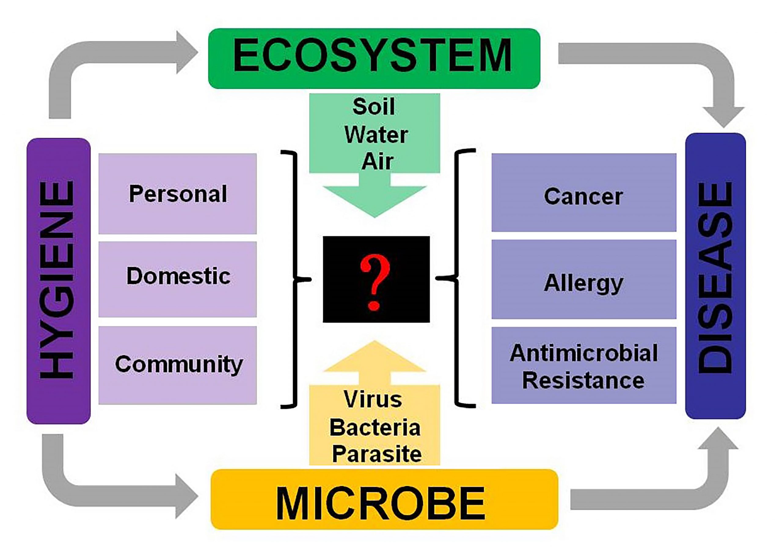 1989年,大卫·斯特拉坎(David Strachan)提出了“过度”卫生可能最终减少人们接触基本微生物的机会,从而削弱他们的免疫系统。例如,他认为过敏、哮喘和花粉热的增加可能与儿童时期较少接触环境中的微生物有关。这就是所谓的“卫生假说”。最近,其他研究人员提出了另一种假说,称为“有针对性的卫生”,强调有必要在接触基本微生物和保护自己免受有害病原体之间取得平衡。