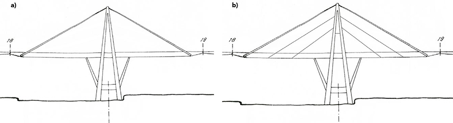 1993年,Rymsza向意大利工程师提交长期解决方案建议Morandi特征复合钢-concrete对角容留不是转移抗拉力的好解决办法,因为它们的冗余性不足。简单解法取自电缆悬浮桥设计测试组件其中包括用水泥屏蔽物下更传统的钢电缆支持支持工作,连接跨线与垂直波段(图4)。Rymsza解释道, 技术正确解决方案减少混凝土悬停加自制钢电缆支持他的建议预知观察-如果他们不以这种方式加强管道,它就可能崩溃。