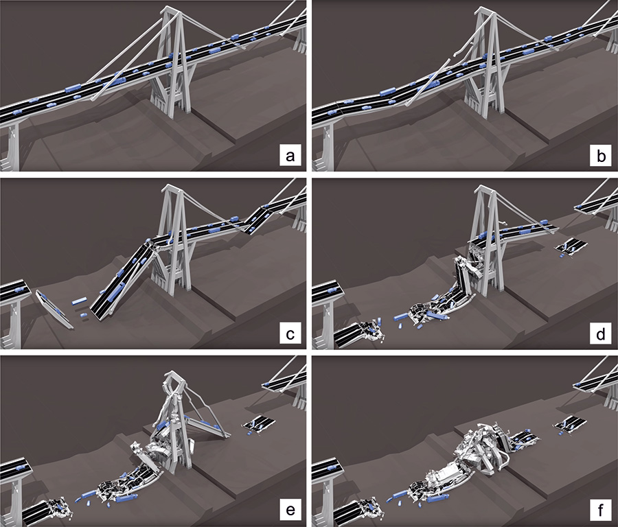 2018年PolceveraVia归根结底,重构当日事件证明Rymsza25年前的观察是悲剧性准确性模拟图5显示悬停电缆顶部9支持破解,导致全压混凝土悬浮约280吨滑入甲板无冗余-如Rymsza建议支持性钢电缆-这立即对路对角混凝土停靠对面立即造成难以为继的压力,触发停机坪、路段和连通垂直塔相继倒塌。