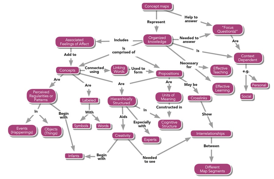其中一种技术是“概念映射”,这是约瑟夫·d·诺瓦克(Joseph D. Novak)和康奈尔大学(Cornell University)的团队在20世纪70年代开发的一种策略,用来代表学生们新兴的科学知识。概念图是一种表示思想、文字或图像之间关系的图解方式。关键思想、文字或图像用箭头连接,箭头上的连接词解释了两点之间的联系,并以一种分层、多层次的方式排列。概念映射的目的是通过揭示事物之间的联系来培养学生的逻辑思维和有效的学习技能,并挑战学生超越个人事实和想法,看到更大的图景。由于学生不再是被动的信息接受者,这种主动的学习工具有可能增加课堂知识的保留;学生在学习时必须用身心参与。此外,通过用图表的形式让学生的理解(或缺乏)清晰可见,老师或其他同学可以“看到”思考和学习过程;错误很容易识别和纠正。在该方法中添加协作学习元素可以进一步增强该方法;学生们一起讨论并绘制地图。 The revision of concept maps can help students retain information for longer, as well as improve metacognition and self-efficacy as they transition to the more academic learning environment of a higher-education institution.