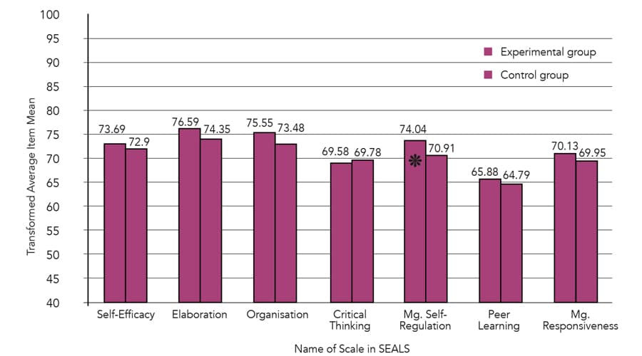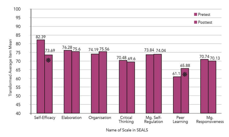 被要求在课程开始和结束时填写允许在群体内部和之间进行比较的课程开始和结束时填写“自我效能和学习调查”(密封)。海豹询问参与者对七件事进行评价自己的信仰:学术自我效力,阐述,组织,元认知自我调节,元认知响应,同行学习和批判性思维。学生还接受了他们的研究生物学策略和100个概念地图,使用了分数表来指出并评分学生在概念映射和与生物知识相关的相关性。比较了学生最终课程等级与密封件的七个元素之间的关系。