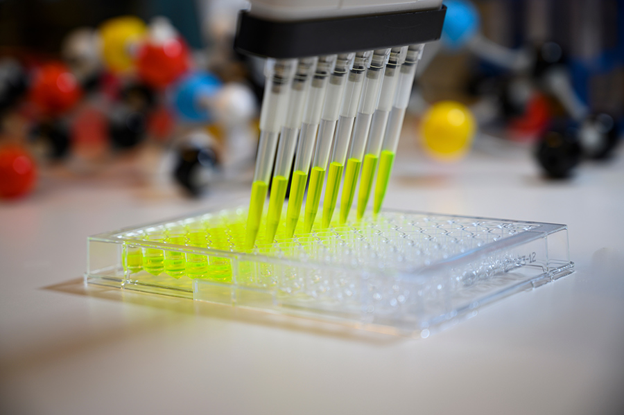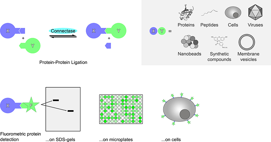 最后,连接酶可以把化学合成的分子引入蛋白质。在药理学中,这在制造抗体-药物结合物时很有用,这种结合物可以用来将药物特异性地带到癌细胞上。或者,蛋白质可以用荧光团标记。这样就可以在细胞内或细胞表面检测到它们。它还有助于在sds -凝胶、微孔板和亲和度测量中检测蛋白质。