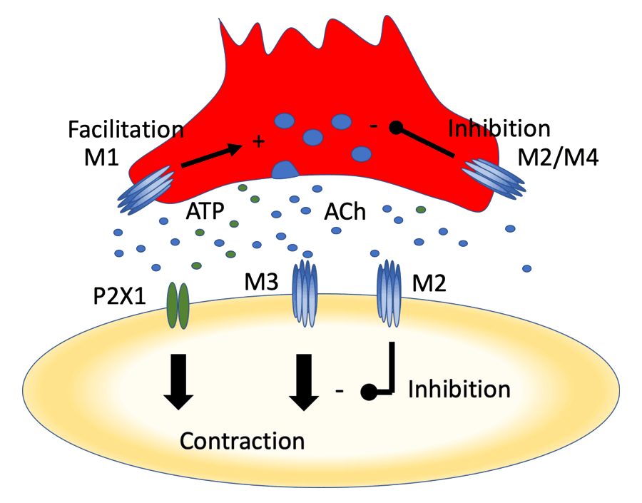 肌肉和神经元上的毒蕈碱受体不同。在平滑肌,它们是毒蕈碱的M3和M2受体。在神经元上,它们是M1和M2/4。在低刺激强度下,膀胱内容物少,有少量的乙酰胆碱被释放。这将作用于毒蕈碱受体M2和/或M4,从而抑制乙酰胆碱的进一步释放。这导致不排出尿液。当膀胱充溢导致信号增强时,更多的乙酰胆碱被释放出来,作用于神经元M1受体。M1受体刺激乙酰胆碱的进一步释放,导致信号放大。最终,乙酰胆碱作用于平滑肌毒蕈碱M3受体,导致肌肉收缩并排出尿液。