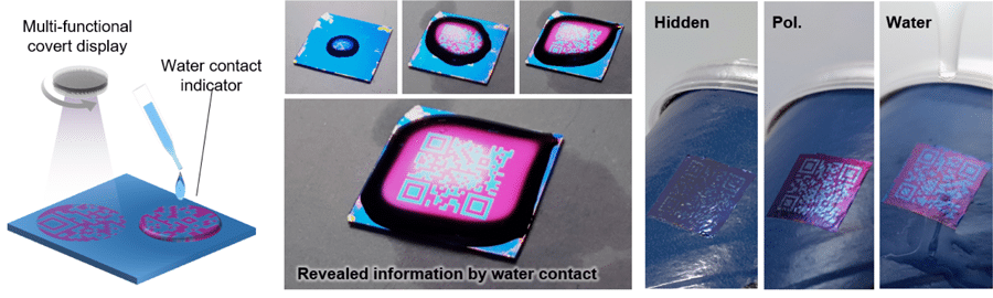 除了这些例子之外,还探索了另一个应用程序,其中使用开发技术的嵌入式QR码在与水接触时可见,表明这些薄膜用于水接触检测目的的适用性。通过敏感性来解释这种能力,以改变盖子偏振显示器上的纳米柱的折射率。折射率灵敏度背后的含义是薄膜顶部的水可能导致薄膜暴露于偏振光的颜色变化相同,从而能够检测和认证QR码。