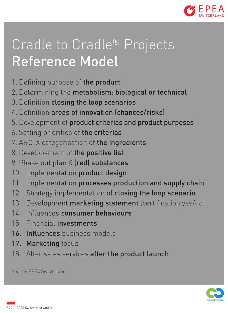瑞士EPEA创建了“从摇篮到摇篮的创新参考模型”,使工业界更容易创造出符合“从摇篮到摇篮”原则的产品。参考模型有18个步骤,其中许多步骤是不言而喻的,例如定义产品的目的。然而,有些步骤不那么明显,因为它们是瑞士EPEA从摇篮到摇篮创新方法的创新。