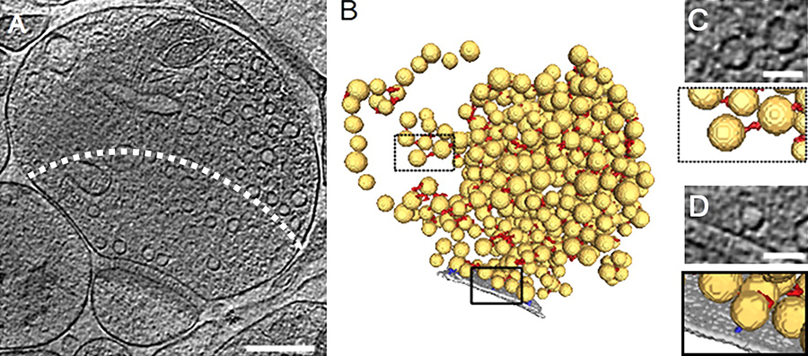 对从啮齿动物大脑中分离出来的突触进行的低温电子断层扫描实验表明,在活跃区,也就是神经递质准备释放的突触区域,突触囊泡被不同类型的细丝固定在突触膜上,与连接囊泡的细丝一起,作为组织囊泡的主要结构元素。为了了解这些细丝在神经递质释放过程中的功能和作用,Lučić博士和他的合作者开发了自动化软件程序,使得在不同释放相关状态下的突触成像中分析这些复合物的形态、精确位置和相互关系成为可能。他们发现,这些纤维是动态结构,对突触刺激作出反应,并通过限制突触囊泡在静止状态下的分散,并允许囊泡在突触活动期间活动释放,来调节突触囊泡的聚集。
