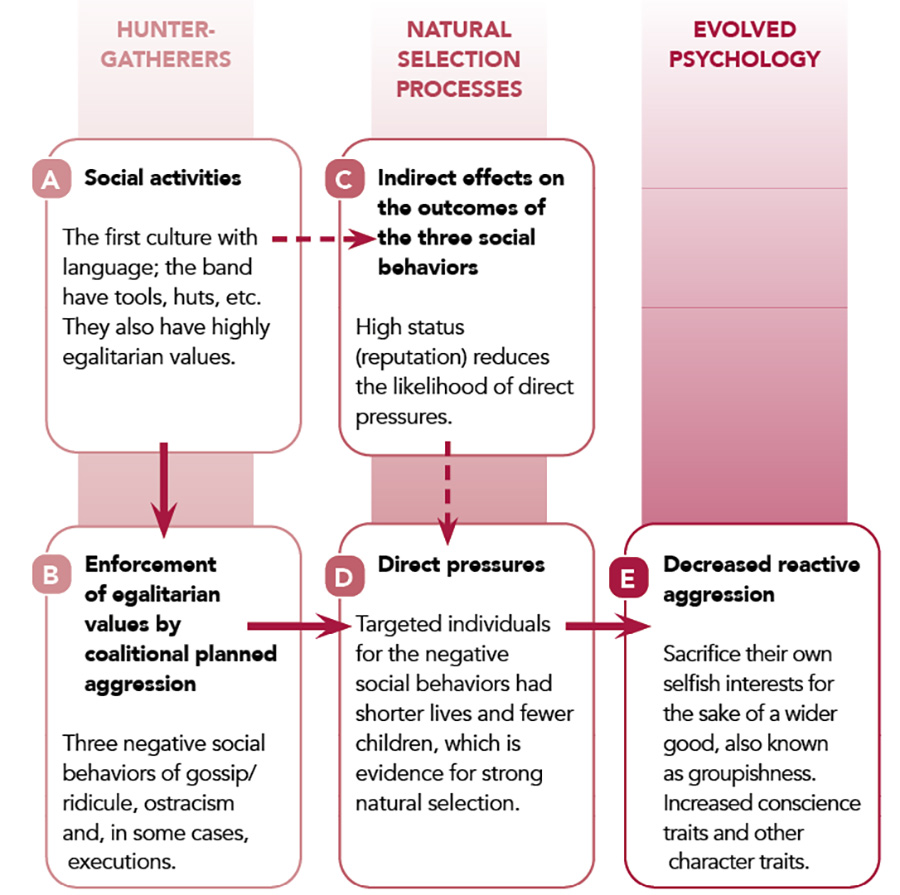 根據Wrangham表示,自然选择压力导致我们线上反应式攻击比黑猩猩减少500至1000倍联盟计划攻击,观察三种负行为,被发现执行高度平等的狩猎采集带值此外,这些过程被确定为产生强烈自然选择心理特征压力显示高度反应攻击者(例如暴君或霸道者)或违反社会规范者往往成为目标预期寿命大幅下降,接受者中子数减少,这是自然选择的有力证据这些结果可以解释我们反作用性特征自我归并, 并称增聚性(图1D和1E)。