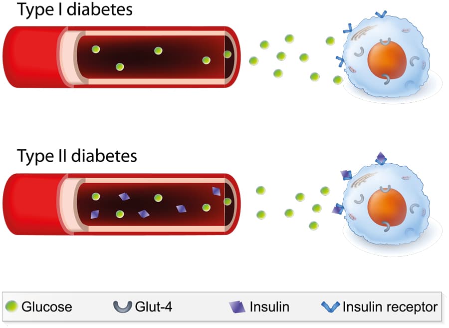 两种疾病的商标虽然是人体对胰岛素的反应。在1型糖尿病的情况下,身体根本不能产生胰岛素。对于2型,可以产生一些胰岛素,但不足以正常功能,或者身体不会响应胰岛素以及应该的胰岛素。这就是为什么这两种类型共享许多相同的身体症状,包括饥饿,口渴,疲劳和频繁排尿。