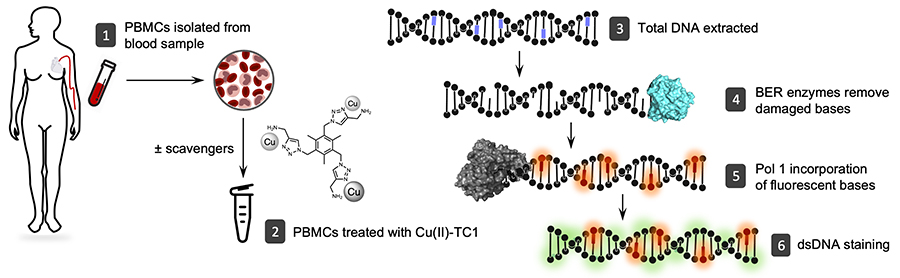 Kellett实验室与Fredrik Westerlund教授和瑞典Chalmers理工大学Vandana Singh博士合作处理用铜-TC1从人体细胞分离脱氧核糖核酸团队使用单分子检测法可视化脱氧核糖核酸的位置和类型测试显示铜-TC1可克服内生细胞脱氧核糖核酸修复机,造成脱氧核酸损坏,而现有的金属基药则无法实现。研究还强调实验室观察与先前观察到的细胞脱氧核糖核酸破坏机制之间有良好的协议,机制由海洋生物自然发现的铜复合体所引起TC综合体应用为高值抗癌剂研究为未来调查人员铺路 通过点击化学物剂开发强化核酸 绕过细胞脱氧核糖核酸修复机制