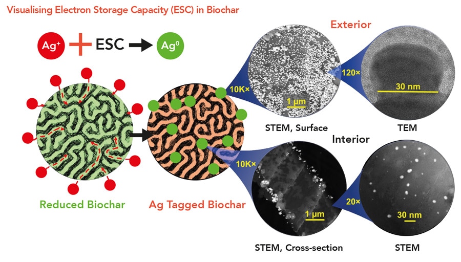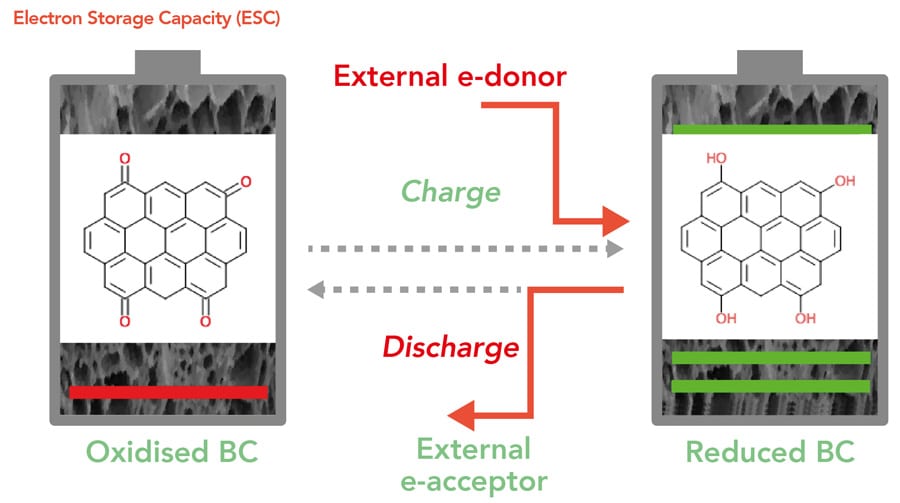 首先由桑德兰·斯坦德和合作者在瑞士,电子存储容量(ESC)是BioChar的先前未被识别的性质,其可用于为生物炭的许多观察到的有益效果设计一种机制。ESC是Biochar将电子与周围环境存储和交换电子的能力。