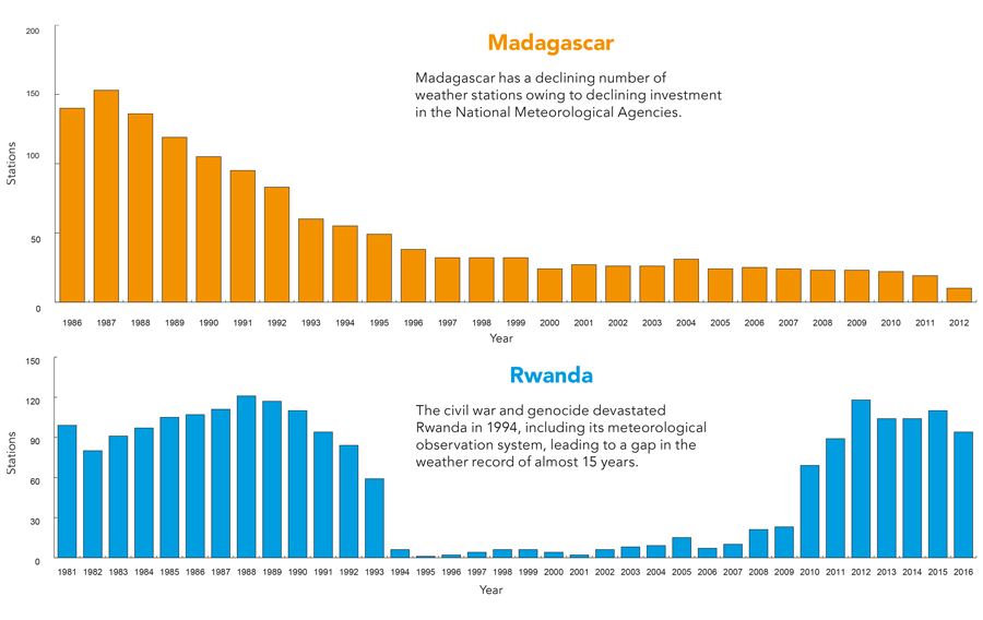 在非洲的许多地方,提供和获得质量气候数据的可用性是拼写的。这种有限的数据可用性的原因是各种各样的,但包括缺乏对气候监测基础设施的投资或维护气候监测基础设施,如气象站,以及由于内乱的破坏。卢旺达的案例可能是后者最令人痛苦和最着名的例子。1994年摧毁了该国的内战和种族灭绝,包括其气象观测系统,导致了近15年的天气记录的差距。