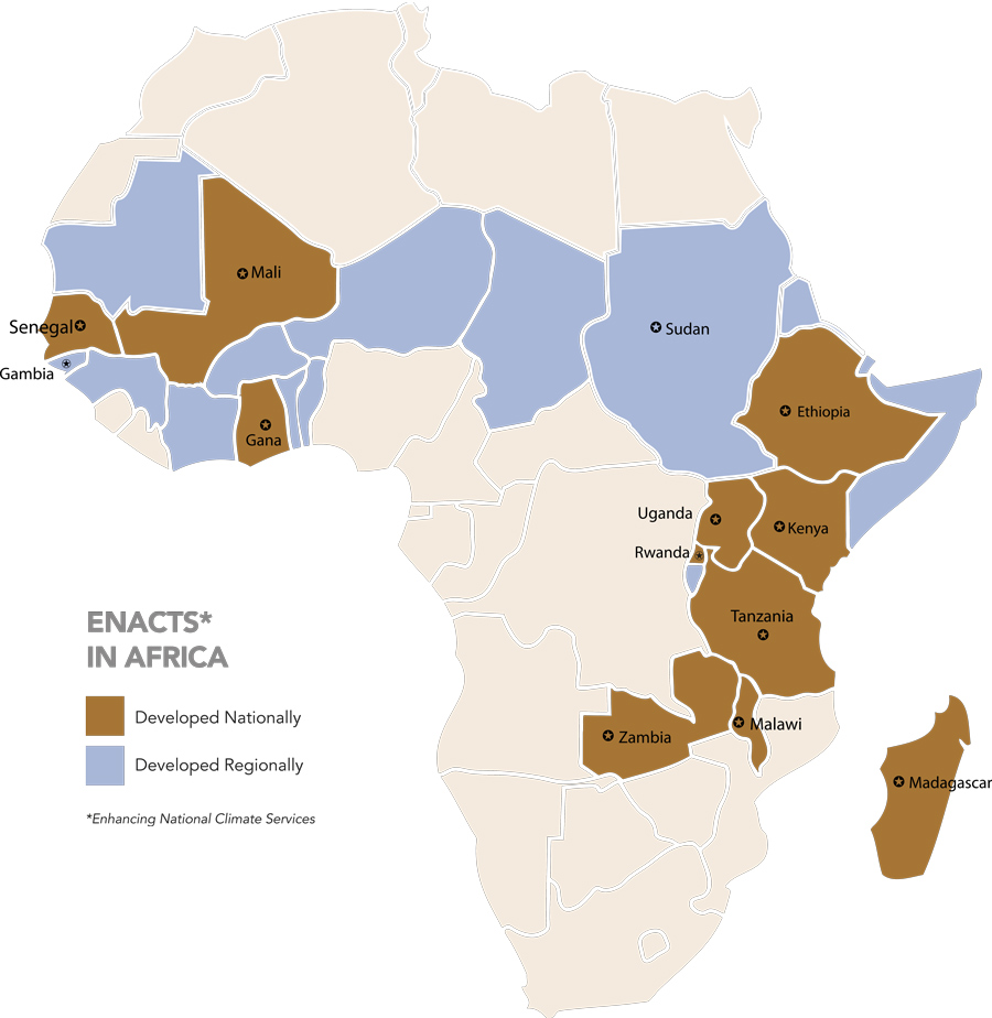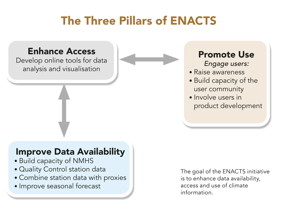 为了帮助应对当前和即将到来的挑战,必须填补气候数据和信息以及利用这些数据和信息的人类能力方面的空白。为此,哥伦比亚大学国际气候与社会研究所(IRI)与当地伙伴密切合作,于2012年启动了“加强国家气候服务”(ENACTS)计划。