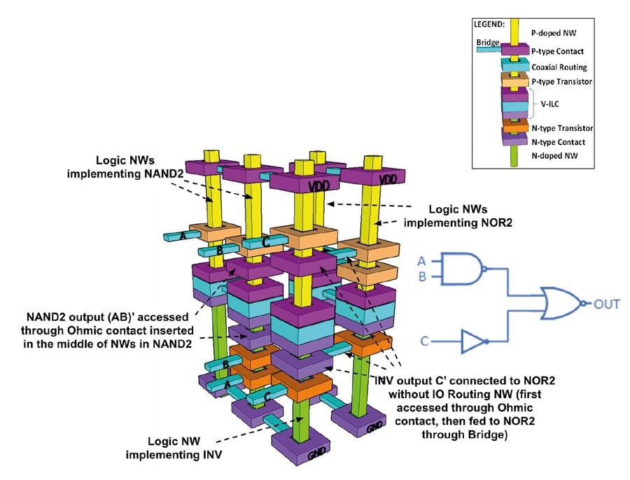 该研究团队正在开发一种新型的垂直细粒度3D CMOS,基于Skybridge的基础,称为vertical -3D-CMOS (V3DC)。他们设计了一种在骨架式垂直纳米线结构上构建静态CMOS电路的系统方法。这些电路都构建在一个均匀的垂直纳米线模板上。由串联和/或平行连接组成的上拉和下拉网络构成。串联网络在一根纳米线上有有源器件,而平行网络是通过在几根纳米线上定位和连接有源器件而形成的。一种特别设计的织物组件,称为垂直层间连接(V-ILC),允许研究人员将上拉和下拉网络连接在一起,以产生输出信号。他们开发了额外的V3DC织物结构,允许垂直和水平连接和热感知电路合成。他们与领先的CAD供应商合作,支持基于商业的自动化工具套件,能够生成和验证大型V3DC Skybridge设计,包括处理器。