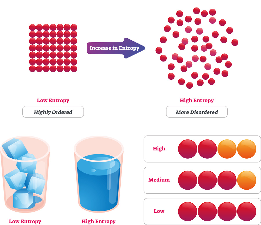 entropy是一个物理概念,起源于物理学家对理解气体粒子大数行为感兴趣的时代(例如气体温度或压力)。Entropy can be thought of as a measure of how well-dispersed the energy of a system is, or how many different ways you could rearrange the system with it still retaining the same overall properties on a macro-scale (eg, the fibres in a ball of cotton can be rearranged in a multitude of ways without the cotton ball changing its overall properties, so it has high entropy, while the strands in a spider web must be arranged in a precise way for the web to hold its shape and serve its purpose, so it has low entropy).The idea that total entropy always increases in a physical process is fundamental in physics, and a decrease in total entropy has never been observed experimentally or in nature.