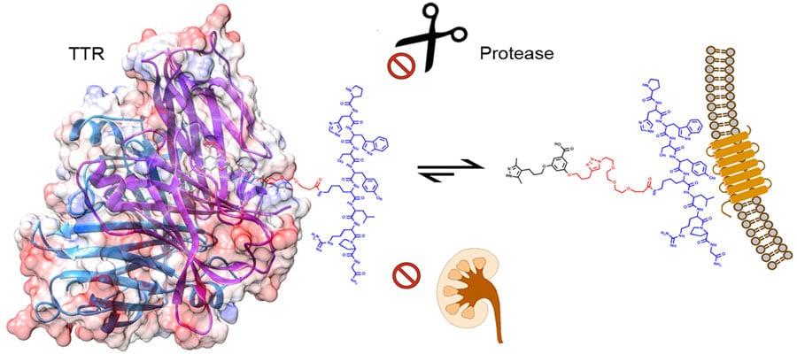 的在活的有机体内Holo-RBP的半衰期(血液中携带维生素A的蛋白质)是大约三个小时。但是,当Holo-RBP与TTR(我们之前讨论的传输蛋白质结合时,在活的有机体内holo-RBP的半衰期增加了三倍。受此启发,Alhamadsheh博士和他的团队将他们的努力集中在上述TTR结合物的类似物AG10上。该团队重新利用AG10类似物,并将其与一些肽结合,从而允许肽在血液中由TTR携带。与TTR的结合为肽抵抗肾脏降解和清除提供了有效和可靠的稳定性。通过改善这些多肽的半衰期,其有效性和在体内的活性能力也得到了提高。通过优化TTR对这些肽结合物的利用和保护,该团队旨在增强治疗肽的药代动力学特性。