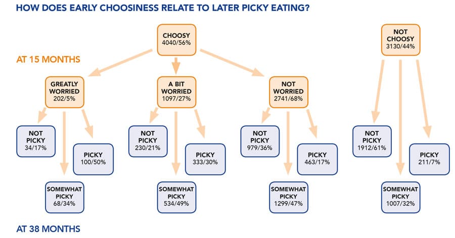 研究人员还调查了可以预测儿童挑食的因素。ALSPAC的数据被用来测量3岁时的挑食,然后探索这种行为的潜在先例。研究发现,补充喂养期间的喂养困难和晚引入块状食物(9个月后)都与增加孩子挑食的可能性有关。一个强有力的预测因素是,孩子在15个月大时变得挑剔,尤其是当母亲担心这种行为时。在15个月大时,大多数(56%)儿童被认为对食物很挑剔。在这些孩子中,如果母亲不担心,17%的孩子在3岁时变得非常挑剔,相比之下,如果母亲非常担心这种挑剔行为,这一比例为50%。喂现成的食物也是对以后挑食的一个预测因素。防止挑食的保护因素是母亲提供新鲜水果并和她的孩子吃同样的食物。