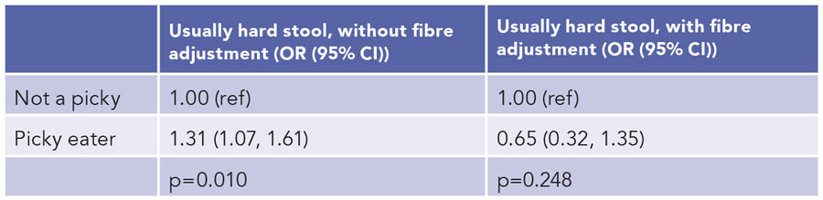 由于较低的纤维摄入量,已经建议挑食与便秘风险增加相关。Emmett和Taylor使用Alspac数据来确定38个月的膳食纤维摄入,然后看看这是否在42个月内预测粪便硬度。还调查了两次这些时间点的挑食。研究人员发现一致的证据表明,挑食的儿童比非挑食者消耗更少的水果和蔬菜,这导致了较低的纤维摄入量。挑剔的食物也比非挑食者更有可能具有硬凳,这是通过纤维消耗的差异来解释的。研究人员表明,通过许多不同的策略可以实现纤维摄入量。这些包括鼓励父母反复提供他们的孩子少量的水果和蔬菜来克服新闻恐惧症(害怕尝试新的食物),为孩子们自己提供一个例子,并通过提供与同一膳食的常规家庭餐饮但没有被迫进入孩子。