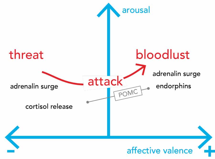 快乐侵略是一种生物学驱动的侵略性行为的形式,不适用于抵抗威胁的目的,但意味着在观察或持续的暴力方面找到一定的乐趣。在生物学水平,食欲性侵略伴随着肾上腺素的激增,以及释放皮质醇和内啡肽,具有多种生理功能的激素,其中一些包括疼痛缓解和欣快感。典型的例子是与狩猎相关的侵略性配置,导致嗜血和“杀戮”中的乐趣。已经发现增强的快递侵略加强了暴力的循环,导致积极的反馈循环,其中一个人反复寻求对感到愉悦或满足程度的暴力行为。