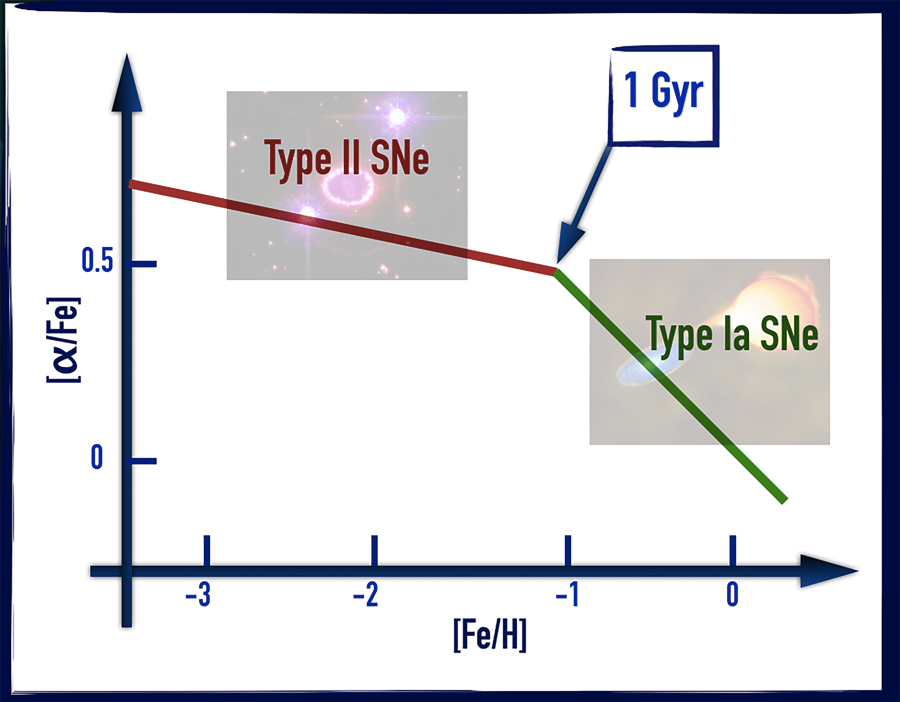 时间尺度差对天文学家大有帮助通过比较星光中阿尔法元素和铁相对丰度,他们可以判断银河结构中是否包含银河系恒星 — — 在Ia型超新星开始出现前早期形成。Matteucci解释方法称时延模型 用于重构星系历史