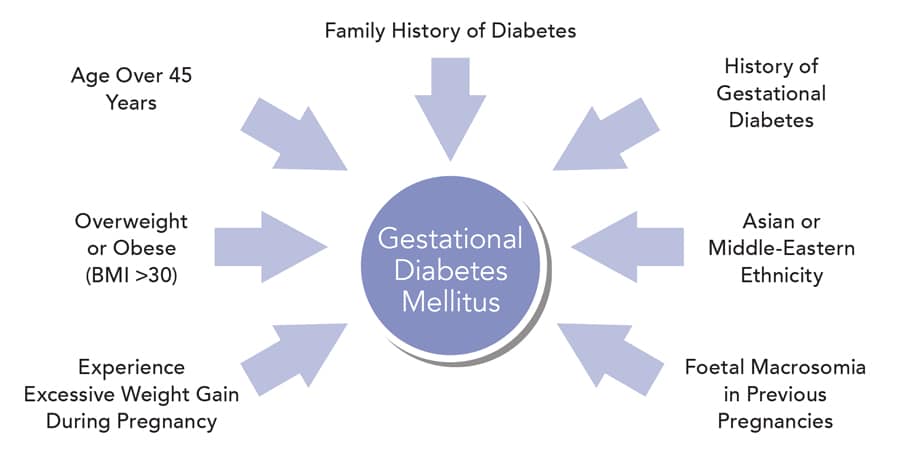 妊娠期糖尿病是一种可能在妊娠期间发生的糖尿病。这种情况可能在怀孕期间的任何时候出现,但它最常发生在妊娠中期和晚期,并在妊娠结束后解决。妊娠期糖尿病是由于胎盘分泌的激素增加,导致胰岛素作用(胰岛素抵抗)减少,并与慢性炎症有关。年龄较大、超重或肥胖(体重指数(BMI)大于30)、孕期体重过度增加或有糖尿病家族史的妇女有患妊娠期糖尿病的风险。其他危险因素包括既往妊娠期糖尿病、亚洲或中东民族和既往妊娠中的胎儿巨大儿(胎龄较大的婴儿)。