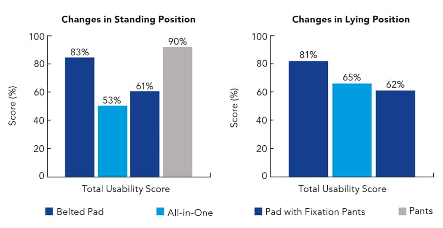 当产品本身比较时,在站立位置发生变化时最佳的那些是TENA裤子和TENA FLEX(带式简报)。当患者躺着时,Tena Flex也在满意的评分时对其满意度进行排名。这是OnSider作为产品的重要因素,因为产品用户会因其流动性和姿势而异;如果用户始终改变上升,则建议束带或拉起产品。