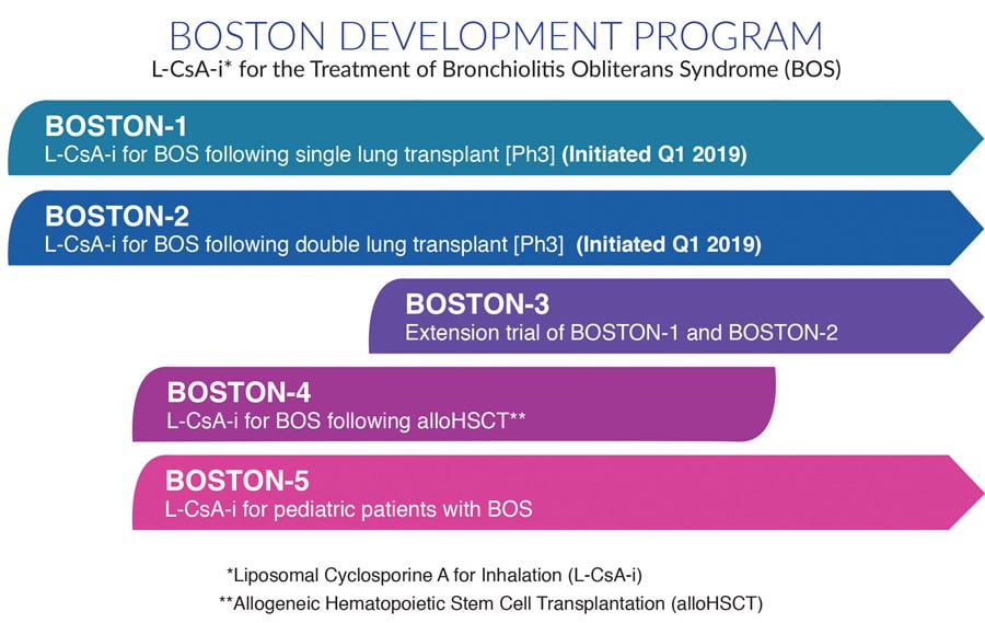 在单肺移植接受者中,Boston-2将相同的方法与BOS一起使用与双肺移植受者一起使用。两项试验将在八个国家的35个主要肺部移植专业中心注册共同参加220名参与者。在完成48周的试验后,参与者将有资格在波士顿-3继续,这是波士顿-1和波士顿-2的开放标签扩展试验。