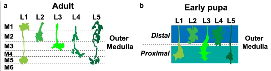 研究人员试图了解基因重要性的一种方法就是去除它!当基因消失或被破坏时,你可以看到它对神经元的影响。在这种情况下,科学家们对L3神经元是否在没有dFezf的情况下在M3上突触感兴趣。马特的研究小组使用了仍在发育神经元连接的果蝇来观察dFezf的重要性。被选中的果蝇处于蛹的发育阶段,幼虫正在蜕变为成虫。在这里,研究人员遇到了一个问题,他们发现成熟的M1-10层在果蝇蛹中不存在!在这个阶段,髓质层还没有完全形成,但他们观察到两个更宽的区域——远端和近端区域。研究人员进行了敲除实验,发现在没有dFezf的果蝇蛹中,髓质远端区域的L3神经元停止生长。然而,在具有dFezf功能的对照蛹中,研究人员发现L3在近端区域突触。似乎在发育过程中,dFezf在将L3靶向至近端区域方面很重要。 The researchers continued to study the flies throughout development. They found in flies without dFezf that the mature layers, M1-10, weren’t distinguished and the neurones displayed abnormal architecture. However, in the flies with dFezf, they found L3 neurons had integrated into the developing M3 layer. By knocking down dFezf the researchers were able to answer their question – dFezf is important for targeting neurons to the correct layer during development!