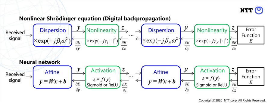 神经网络被认为是模仿我们大脑的工作方式,被广泛用于机器学习,因为它们可以捕捉“神经元”或处理点之间非常复杂的关系。通常情况下,人类很难发现这些模式和关系,而且神经网络的数据处理和分析也可以自动化。在Sasai的案例中,他创建了一个“学习NLSE”网络,利用方程和神经网络之间的相似结构,使用接收到的数据来计算信号损耗和色散,而不需要任何额外的测量设备,如OTDR。
