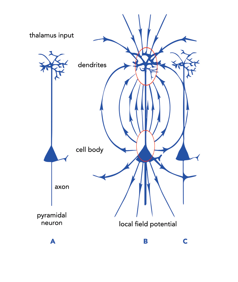 LTP启动时,Telamus动作潜力与金字塔反射产生神经传输器释放,跨空格绑定drite受体(图1)。绑定引出负离子注入离细胞体远端(图2A)。保持电中性,细胞体有增益离子,形成局部场潜力并生成金字塔神经元周围空间电波(图2B)。流水波中现在包含信息 疼痛前编码