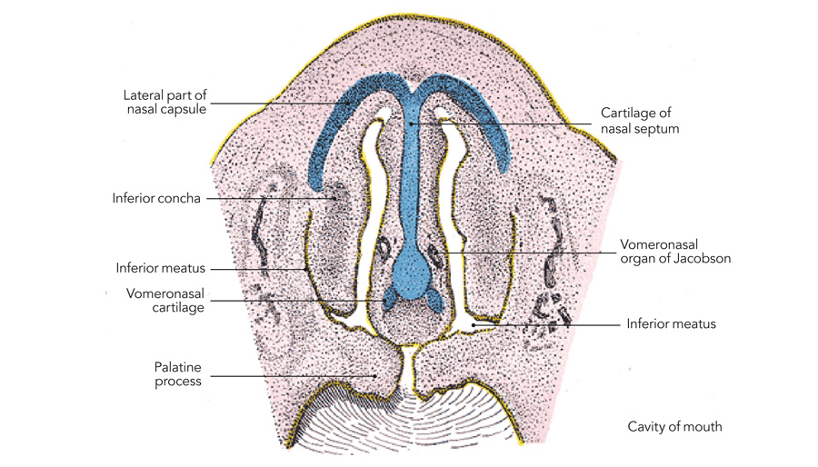 研究结果显示,大多数人类都有一个小管状VNO2-10毫米间长度,最后以小袋向鼻子后端结束并发式芯片并非总能连接到机体常导出不同结构 鼻子内, 或 gland管道或结构 称nasopalatine休眠或fosa发现后提出了一个重要的问题,即如果二维互连通, 未来phemons将如何传递到VNO