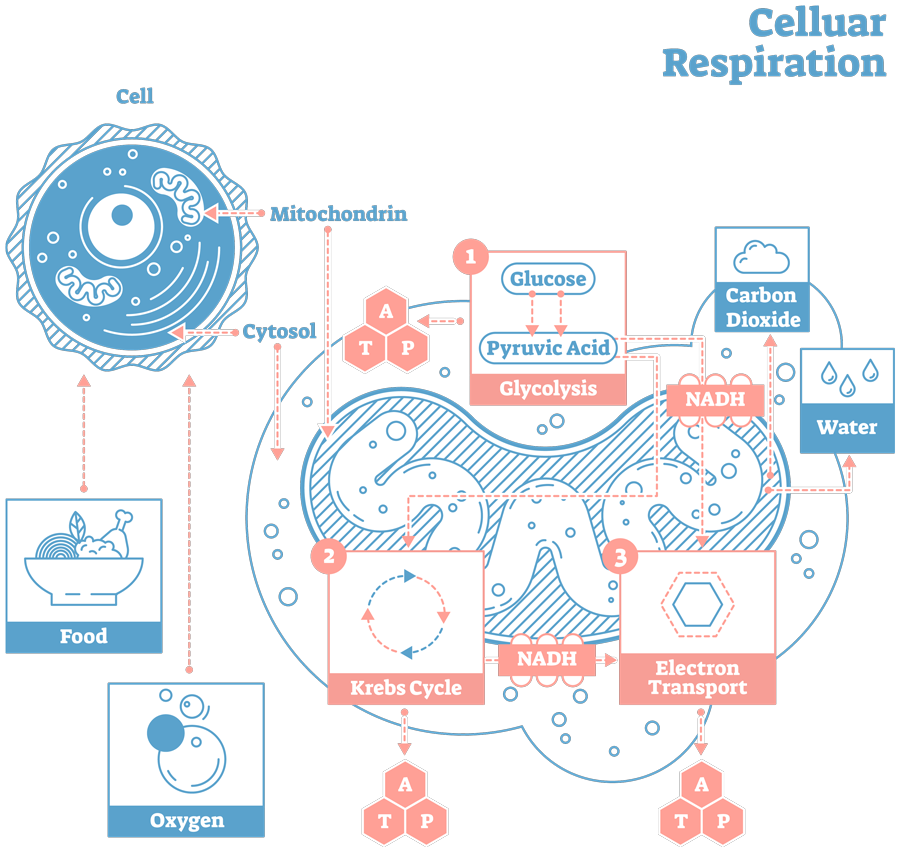 当诸如碳水化合物(糖和纤维)的能量源,脂肪或蛋白质进入细胞时,它进入线粒体,并通过连续转化为称为克雷布循环(或柠檬酸循环)的反应。然后将克雷布循环的产物用于第二代谢途径,称为氧化磷酸化。它是通过氧化磷酸化,即ATP,细胞中的通用能量货币,是产生的。