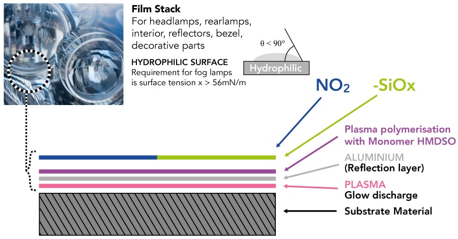 目标是制造亲水性表面。这个问题可以通过“功能化”技术来解决,“功能化”技术将分子中的富氧基团或“官能团”附着在聚合物表面。如果处理得当,这些基团可以更牢固地与油漆和涂层中的分子结合,使表面整体上更具粘性。由于功能化传统上涉及使用有害化学物质,制造商最近开始通过使用等离子体(一种含有热的、自由流动的带电粒子的物质状态)沉积官能团来减少它们对环境的影响。