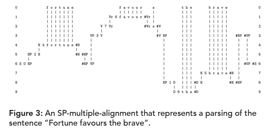 A large part of the workings of the SP System is a process of creating and selecting ‘good’ SP-multiple-alignments like the one shown in Figure 3, which shows how the system may analyse or ‘parse’ a sentence (in row 0) into words and other grammatical structures.2