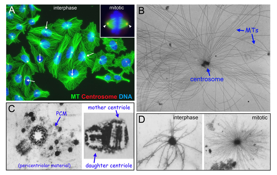 B.Centrosome是一个微管组织中心。电子显微镜通过用微管亚基蛋白,管蛋白孵育分离的CentroSomes,在微管体外聚合微管聚合到中心体上。