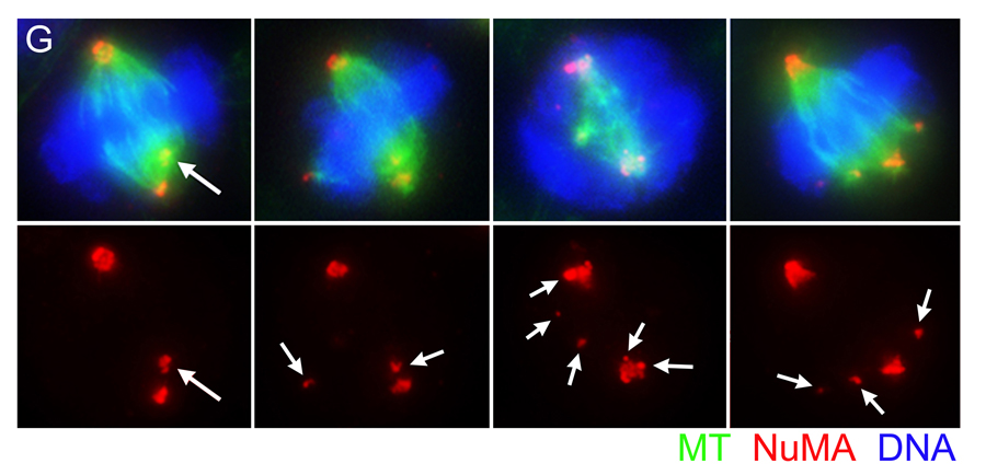 为了检查这些主轴结,该团队研究了核有机丝仪(NUMA)的分布,这在运输中间的核型装置蛋白(NUMA)的分布在单独地组装的微管中(棱囊组体微管),将其一个端部合并到杆中并附着主轴 -杆纤维到中心体(f)。由于多个未聚焦的主轴端部,其中存在NUMA,杂交的主轴结可能具有高度随机分布的NUMA(G)。该假设得到了证实 - 研究人员指出,在单独的Cep215耗尽的细胞中,以及Cep215,Cep15和Paura的三重耗尽,观察到增加数量的随机分布的NUMa。Kuriyama和她的团队建议这些结果表明,Cep215,Cep192和Paura作为一种蛋白质复合物,通过确保每个主轴杆的中心的Numa的聚焦分布在一起,以使两种类型的MTS,Centosomal和AceNtrosomal的结束一起起作用(F因此,并因此将每个杆的连接到中心组。