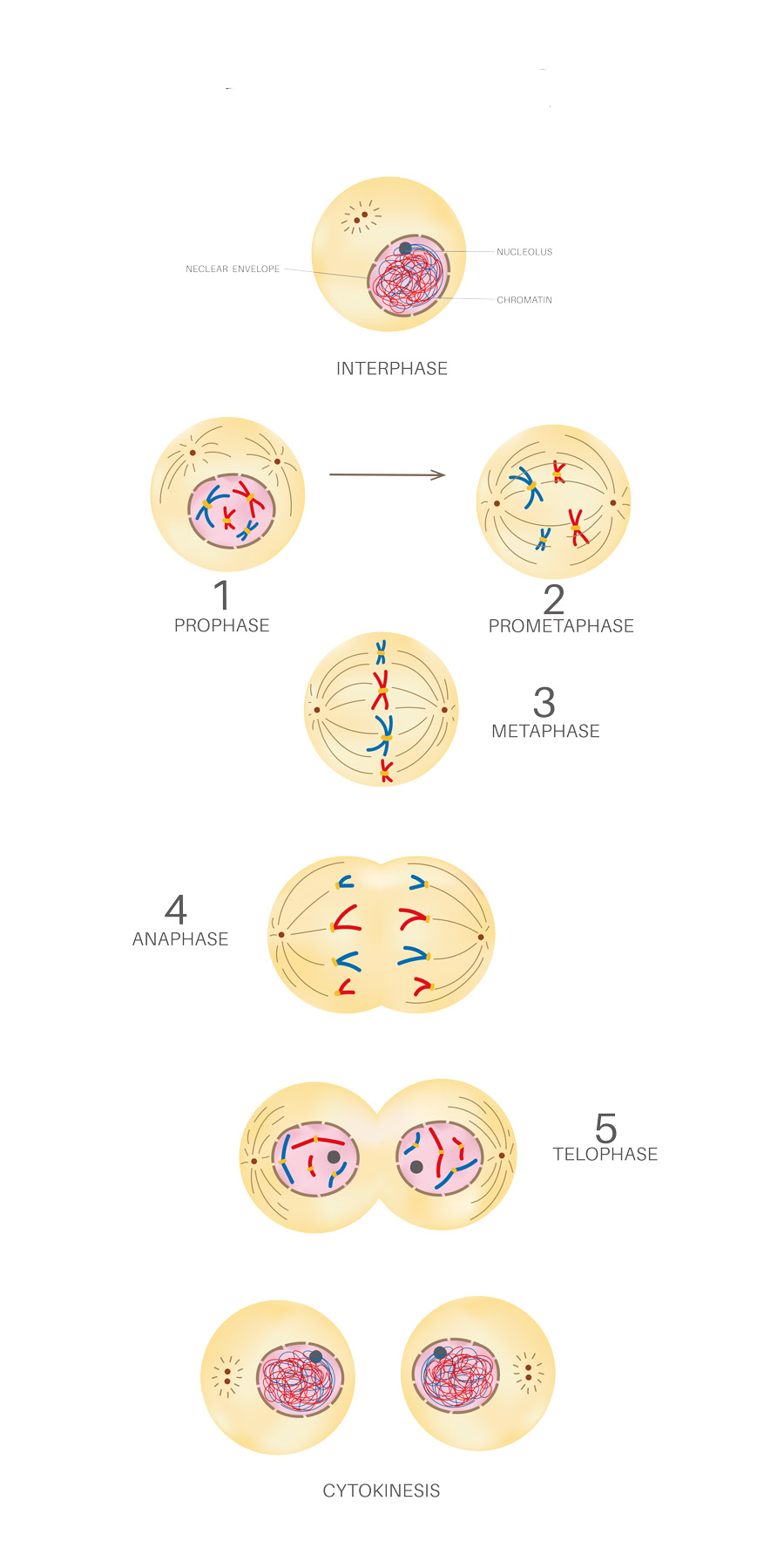所有的细胞都必须生长和分裂才能保证宿主的生存。在哺乳动物中,体细胞通过细胞周期进行增殖,细胞周期包括两个主要阶段,间期和有丝分裂(有丝分裂或细胞分裂阶段)。在间期,细胞产生蛋白质和细胞器,复制它们的遗传信息。在有丝分裂(有丝分裂和胞质分裂)中,重复的DNA被平等地分离成新形成的细胞核,产生两个新的细胞。有丝分裂本身包括五个阶段:前期、前中期、中期、后期和末期。在前期,两个被称为中心体的蛋白质结构迁移到细胞的相反端,复制的DNA链开始浓缩。经典的“X”形染色单体,也就是我们所说的“姐妹染色单体”,由着丝粒连接在一起。着丝粒是DNA的一小部分,它将复制的两半结合在一起,在早期细胞中变得很明显。一旦成年体细胞中保护遗传密码的核膜溶解,细胞进入中期,浓缩的染色体在细胞中间排列。