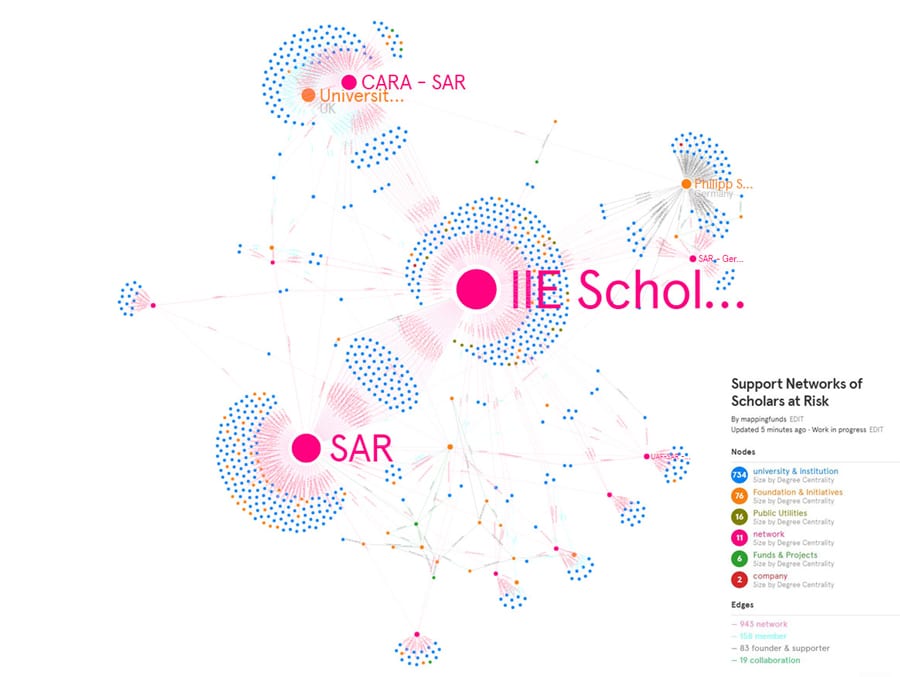 地图基金项目的初始阶段已于2018年完成,该项目追踪并绘制了大学、研究机构、公民社会组织、公共和私人捐助者之间的支持关系网络。该项目始于土耳其的和平学者组织,但其主要动机是保护学术界和流亡知识的自由,已在世界各地找到了团结。