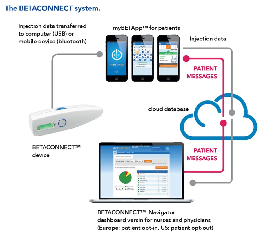 有帮助的是,一个基于技术的多发性硬化症治疗系统已经存在,为Schürks教授和Müller博士的研究形成了一个有用的环境。在德国,大约80%使用干扰素-1b治疗的多发性硬化症患者使用电子自动注射器。这是一种可以快速、简便地注射药物的设备,而且对这项研究至关重要的是,它可以自动记录每次注射的数据,包括日期、时间、速度和深度。患者也可以选择使用一款名为myBETAapp的应用程序。注射器会自动将注射数据发送到应用程序,该应用程序会跟踪患者一段时间的用药情况。这款应用还有一个“健康追踪器”,允许用户记录影响他们日常生活的症状,如能量水平、协调性、行走能力和饮食习惯。