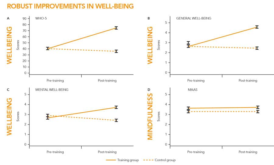 此外,对主题和更具有个人和独特的前后和课程的定性分析进行了评估,以评估一个人气的实践如何影响参与者以及他们如何在课程前后观察他们的福祉状态。两种分析形式引入了包含5点李克特级别的自我报告措施。进行了比较对照和实验组之间的平均评分的定量测量。实验组完成器和对照组完成方之间的分数显着显着差异,实验/培训课程完成者在WHO-5上具有明显更高的分数。然而,MAA措施没有显着变化,需要进一步调查。此外,实验或培训组在定性分析中,在定性分析中的培训前和后期培训之间表现出显着的正差异,这也通过添加了两个开放式问题来产生自由表达。因此,世卫组织5分数和通用福利分数之间的变化与通用井绕得分之间的正相关性暗示净空MBI通常导致良好措施的改进。
